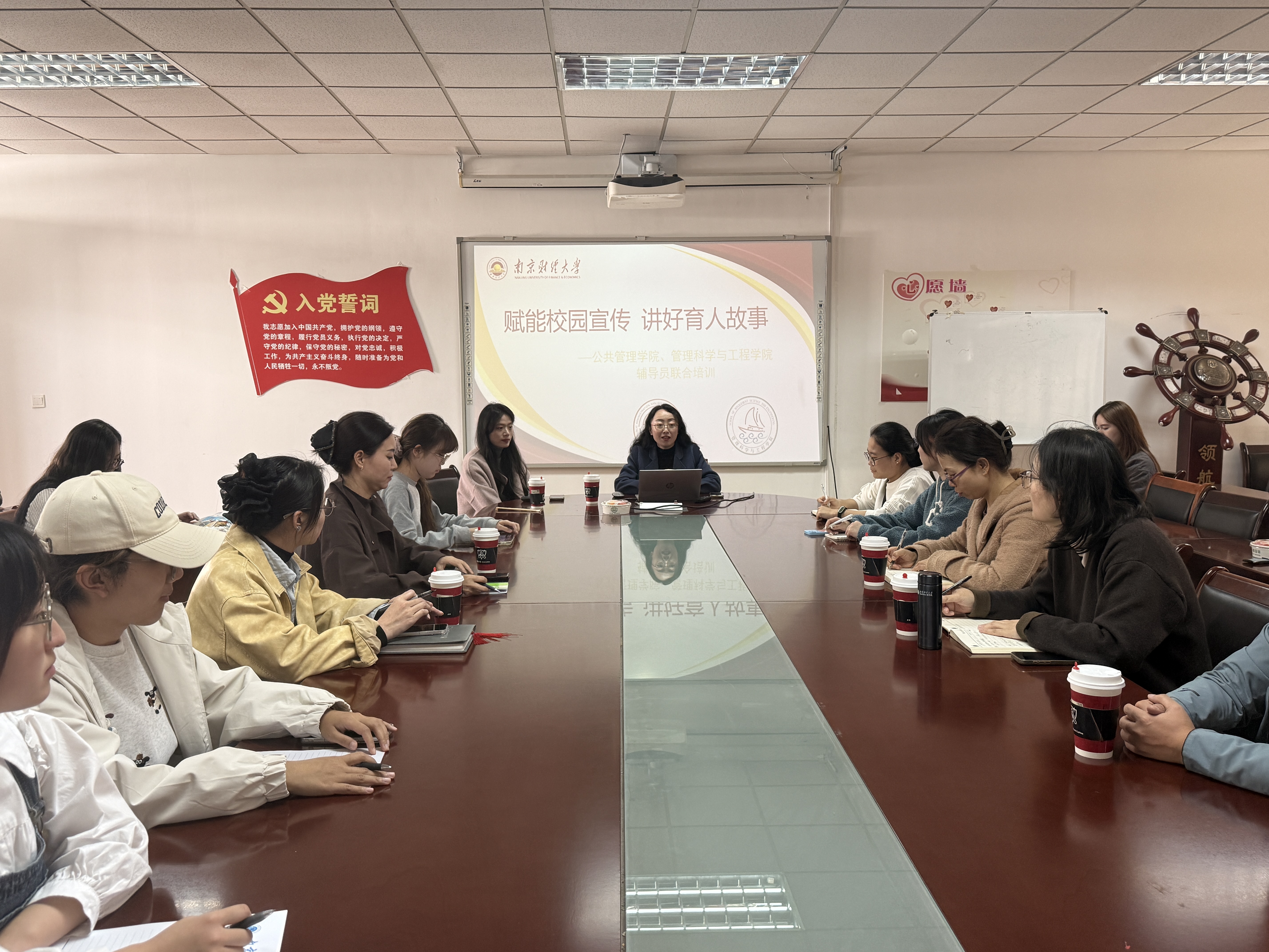 为全面提升学院新闻宣传的能力,特别是新媒体时代下公众号内容的编辑与推送水平,10月31日中午,由公共管理学院与管理科学与工程学院联合举办的“赋能校园宣传,讲好育人故事”辅导员联合培训在德济楼508教室顺利举行。本次培训邀请了南京财经大学专业负责校公众号的李敏老师进行相关技能的分享,两学院的辅导员及团委、学生会的部分成员参加了此次学习。