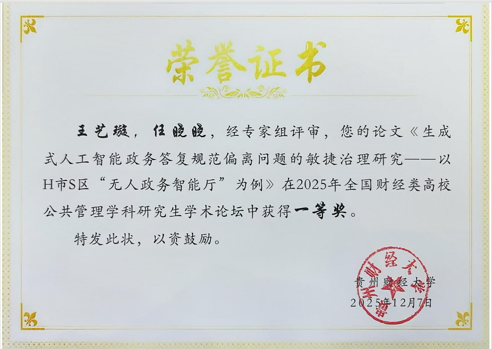 在论坛组织的优秀论文评选中,我院马一凡、任晓晓两位同学的研究成果获得评审专家一致认可,荣获一等奖,为学院赢得了荣誉。论坛一等奖由国务院公共管理学科评议组联合召集人丁煌教授和贵州财经大学党委书记缪坤和教授颁发。
