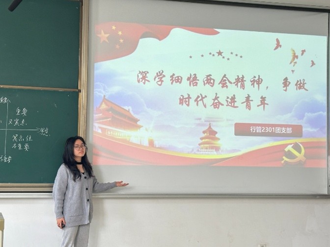 为深入学习贯彻2026年全国两会精神,强化青年学生思想引领,引导团员将个人成长与国家发展同频共振,行管2301团支部精心组织开展“深学细悟两会精神,争做时代奋进青年”专题学习活动,全体团员全员参与、全程投入,以沉浸式学习、沉浸式研讨、沉浸式谋划的形式,推动两会精神入脑入心、落地生根,切实发挥思想引领核心作用,取得良好育人实效。
