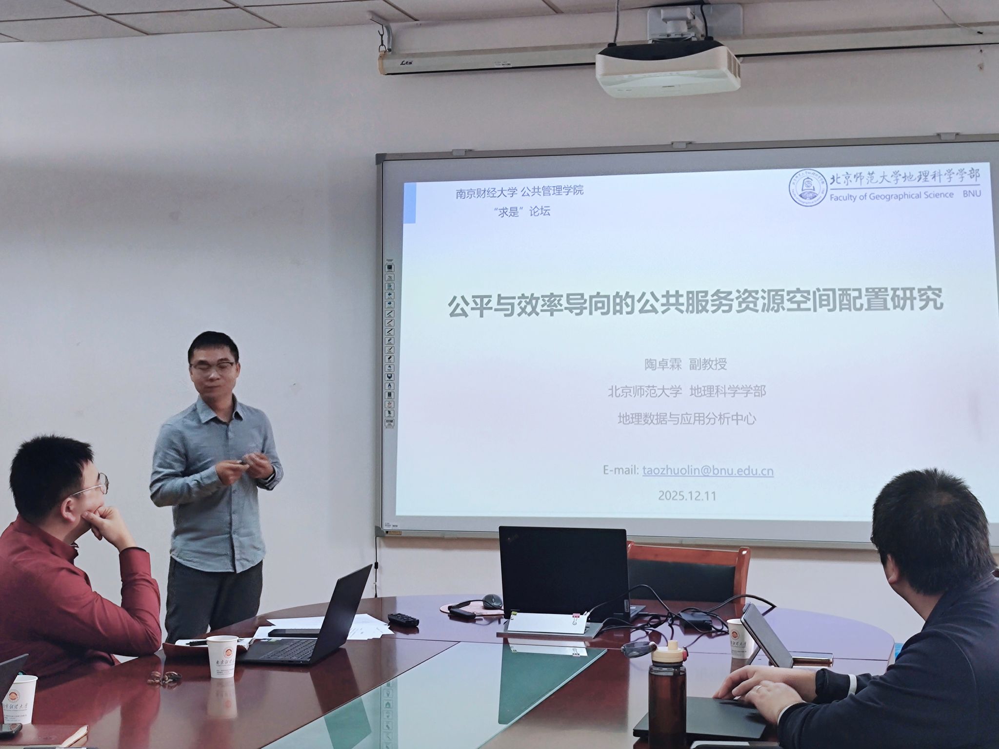2025年12月11日上午9:00,南京财经大学公共管理学院“求是”论坛第86期在仙林校区德济楼508会议室成功举办。本次论坛特邀北京师范大学叶思菁副教授、陶卓霖副教授作为主讲嘉宾,分别就耕地生态退化治理与公共服务资源空间配置两大热点议题展开学术分享。学院部分骨干教师、研究生及本科生参加了本次讲座。
