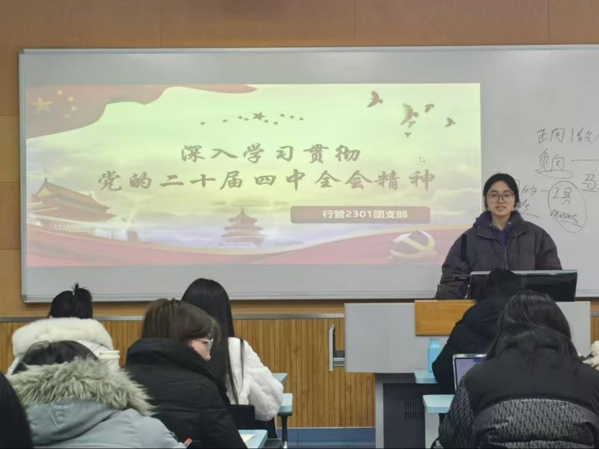 行管2301团支部开展以“践行四中全会精神,争做时代实干家”为主题的团日活动,主持人带领团员青年回顾党的二十届四中全会时代背景与核心议程,重点解读《中共中央关于制定国民经济和社会发展第十五个五年规划的建议》,深入阐释全会在高质量发展、科技自立自强等关键领域的战略部署。学习过程中互动活跃,针对“行管专业学生如何在基层治理中落实全会精神”的提问,主持人引导大家以数字化思维提升治理效能、践行人民至上理念。此次活动为团员青年带来深刻思想洗礼,激发其使命感,大家纷纷表示将把全会精神转化为学习动力与实践行动,以专业所长为国家治理现代化贡献青春力量。